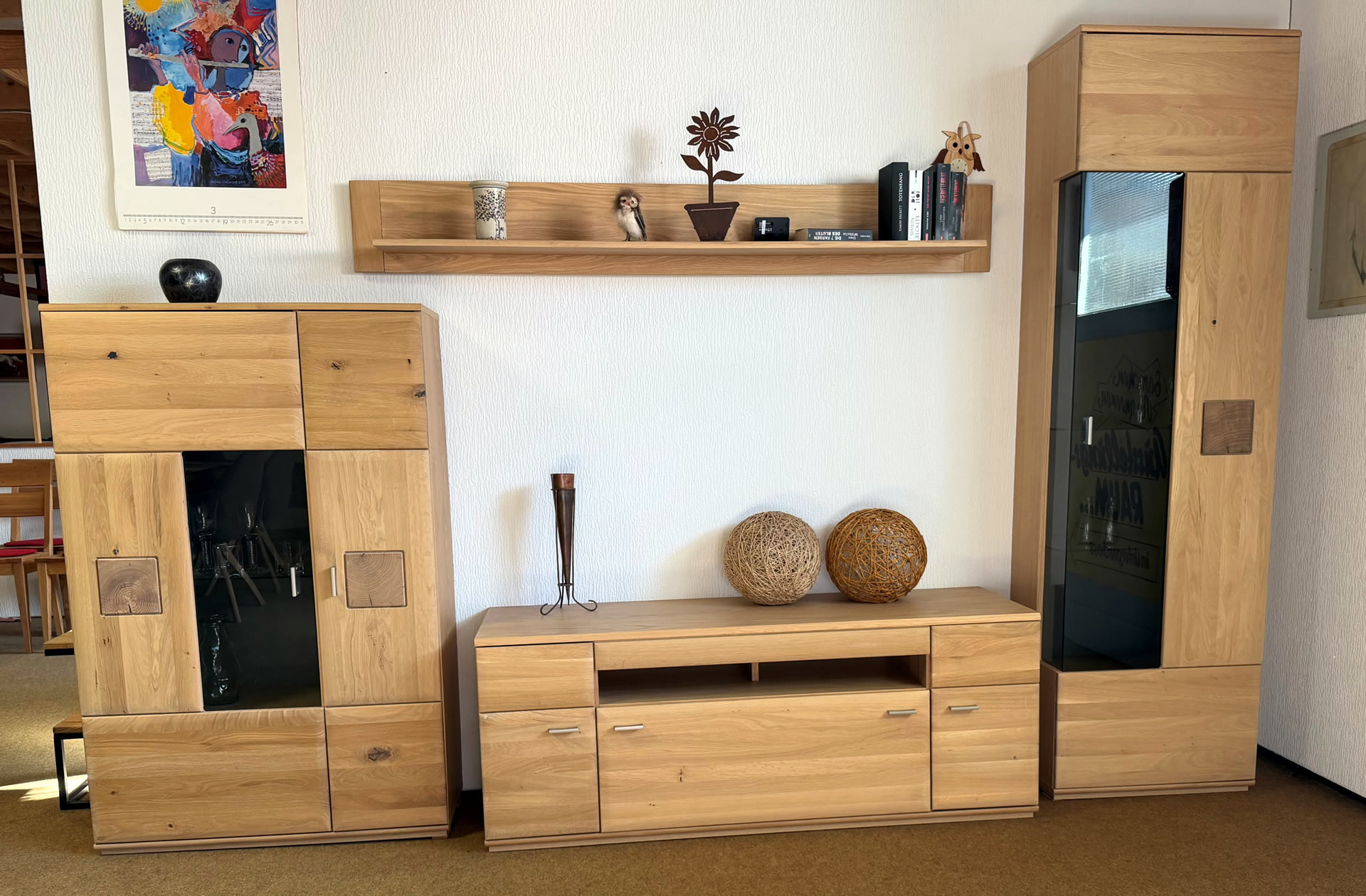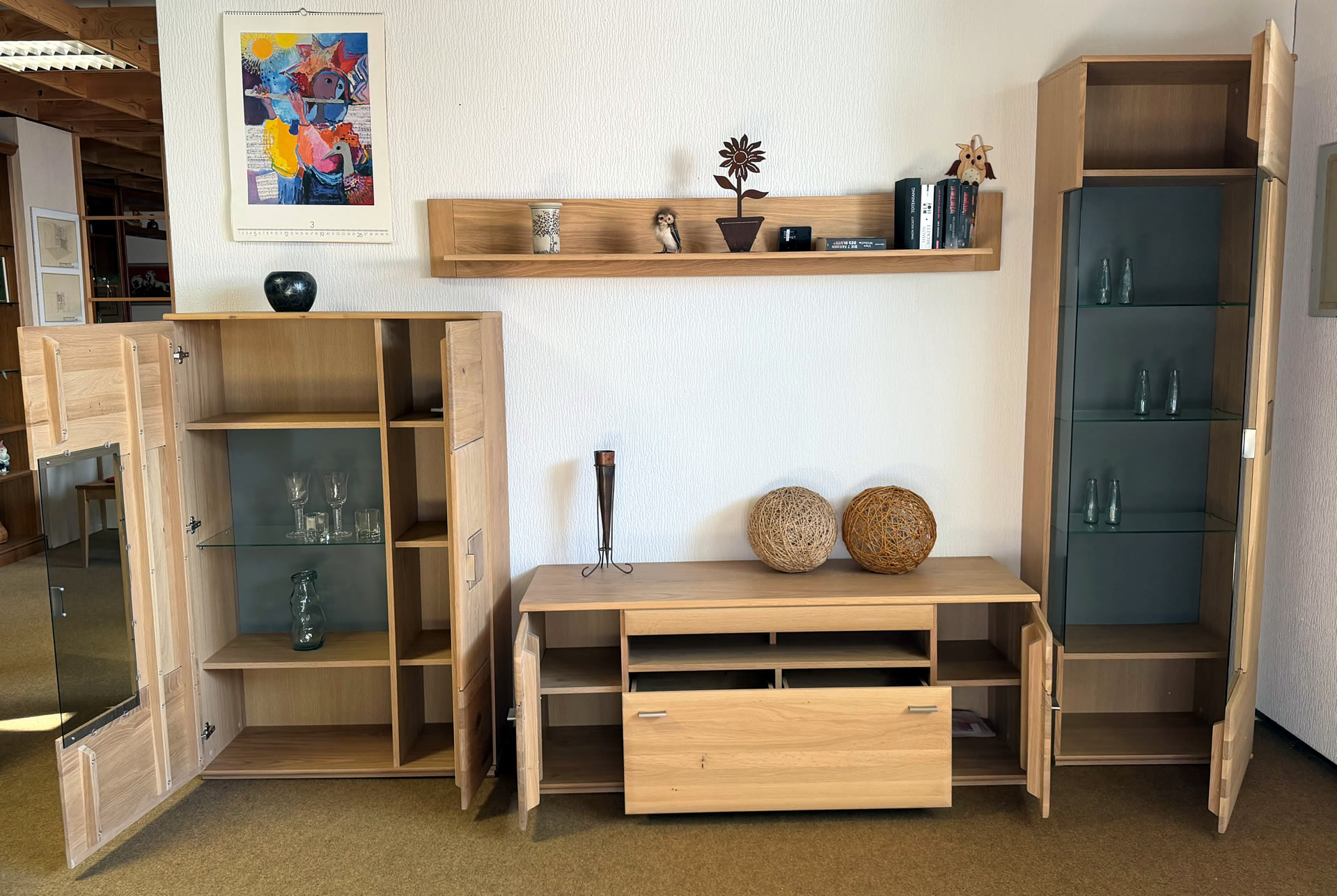 Wohnwand Asteiche massiv geölt von Decker ca. B 320 H 195 T 24-60 cm inklusive 1 Schrank mit 2 Türen links Holztür, rechts Glastür inklusive 1 TV-Bord inklusive 1 Schrank mit 2 Türen, links: Glastür, rechts: Holztür inklusive Wandbord
