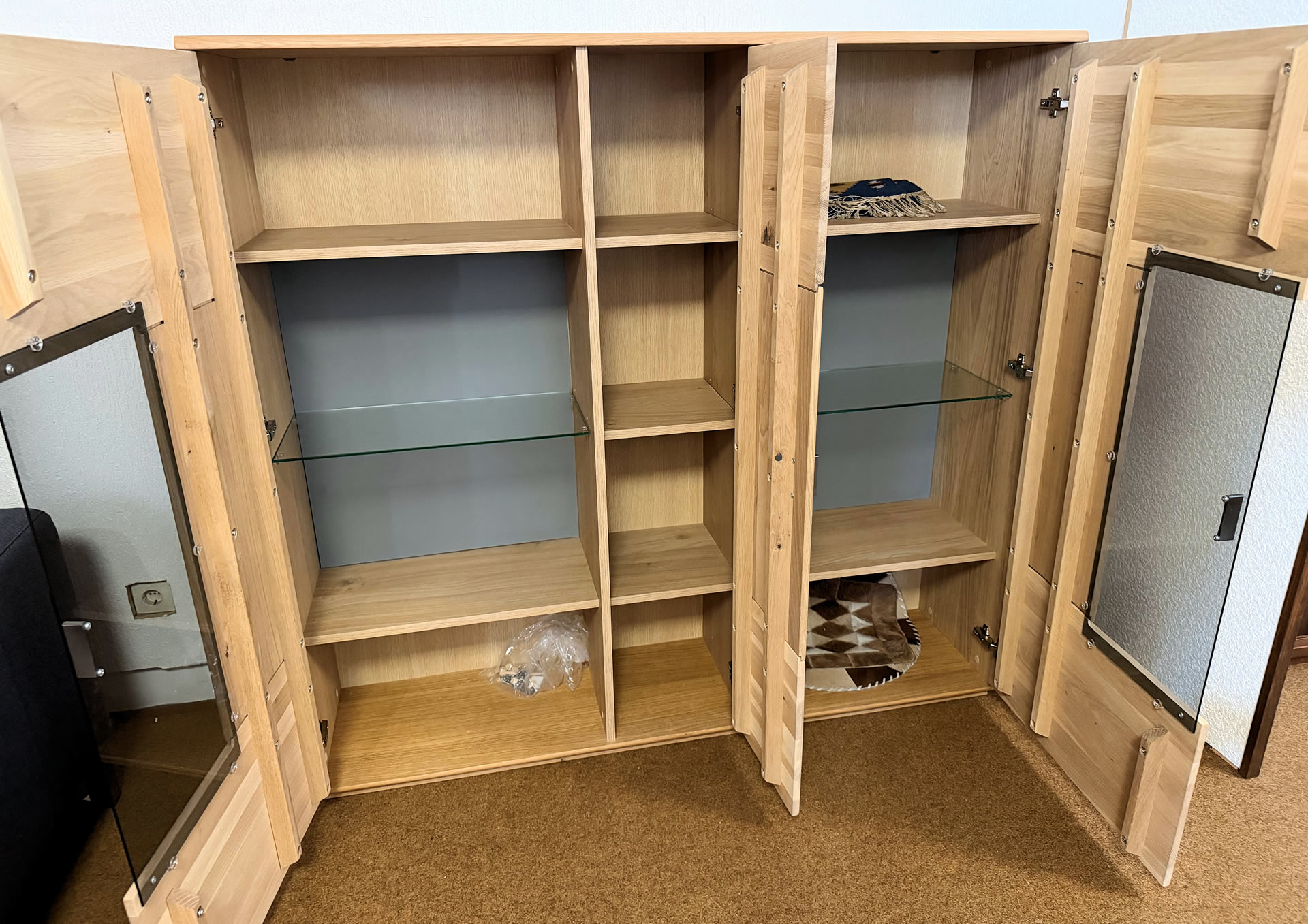 Wohnwand TL 1894 (4-teilig) - Modell Bologna - von MCA - Ausstellungsstück!! Modell: Bologna Hersteller: MCA furniture Front: Eiche Bianco DL. massiv mit Hirnholz Applikationen geölt Korpus: Eiche Bianco furniert OF geölt Einlegeböden: Dekor NB Ober und Unterböden mit profilierten Eiche massiv Anleimern Frontglas: Parsol grau Türen + SK: gedämpft Griffe: Metall matt Nickel Ca. Maße: B 320 H 208 T 50 cm bestehend aus: 1x Highboard links ca. B 90 H 41 T 38 cm 1x TV-Element ca. B 150 H 58 T 50 cm 1x Wandbord ca. B 180 H 24 T 25 cm 1x Vitrine rechts ca. B 60 H 208 T 38 cm Sonstiges: ohne Dekoration ! (Gesamt-)UVP: 3.247,- € Bisheriger Preis: 2.810,-€ Abverkaufs-Sonderpreis für Ausstellungsstück: 2.598,- €