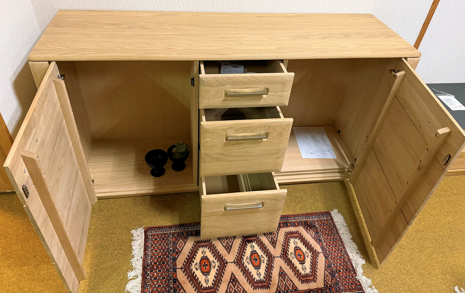 Sideboard TL 1221 - Modell Sena - von MCA - Ausstellungsstück!! Modell: Sena Hersteller: MCA furniture Front: Eiche Bianco massiv, DL. geölt Korpus: Eiche Bianco furniert geölt Einlegeböden: Dekor NB Türen + SK: gedämpft Griffe: Metallgriffe Ca. Maße: B 161 H 85 T 47 cm Sideboard TL 1221 mit 2 Türen, 3 Schubkästen, links und rechts jeweils ein Fachboden Sonstiges: ohne Dekoration ! (Gesamt-)UVP: 1.574,- € Abverkaufs-Sonderpreis für Ausstellungsstück: 998,- €